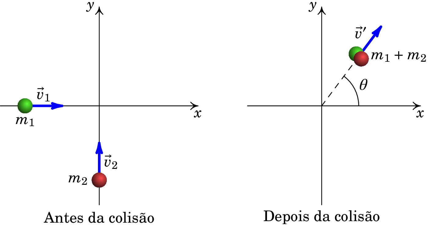 2. Considere-se o seguinte esquema:Duas partículas de massas kg e kg colidem, no plano horizontal, permanecendo juntas após a colisão. Antes da colisão, a partícula 1 movia-se de oeste para este com velocidade de valor 6 km/h e a partícula 2 movia-se de sul para norte com velocidade de valor 8 km/h.