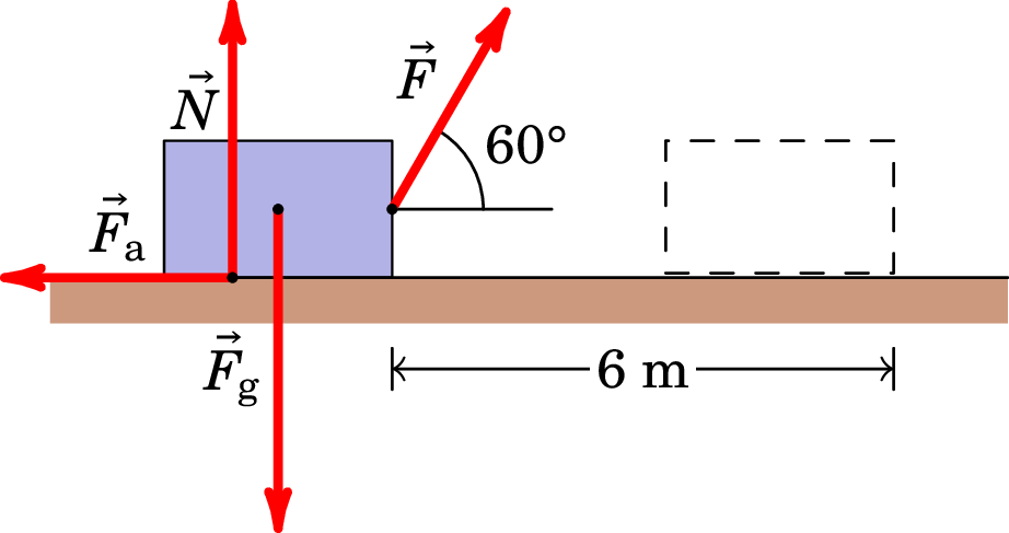 22. De acordo com o esquema abaixo representado, um bloco de massa 5 kg é deslocado horizontalmente, da esquerda para a direita, ao longo de uma distância de 6 m, por ação de uma força de magnitude 40 N, cuja direção forma um ângulo de 60° com a horizontal. Sabendo que o bloco partiu do repouso e que o coeficiente de atrito cinético entre o bloco e a superfície é de , determine: