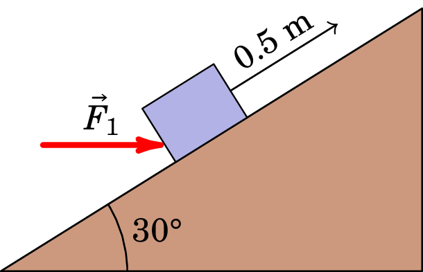 27. Uma força horizontal de módulo 20 N é aplicada sobre um livro de 3 kg, fazendo com que este se desloque 0.5 m na rampa, como se pode ver na figura abaixo. A rampa possui inclinação de 30°. Considere que não existe atrito entre o chão e o livro.