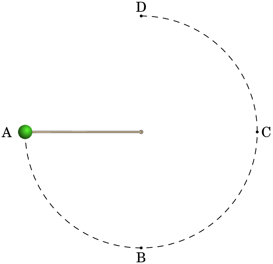 29. Uma bola de massa 0.341 kg está pendurada por uma haste rígida, de massa desprezável e comprimento 0.452 m, que articula sobre o centro, conforme representado na figura abaixo. A haste está inicialmente na horizontal, A, sendo depois empurrada para baixo com força suficiente de modo a que a bola atinja o ponto mais alto, D, com velocidade nula.