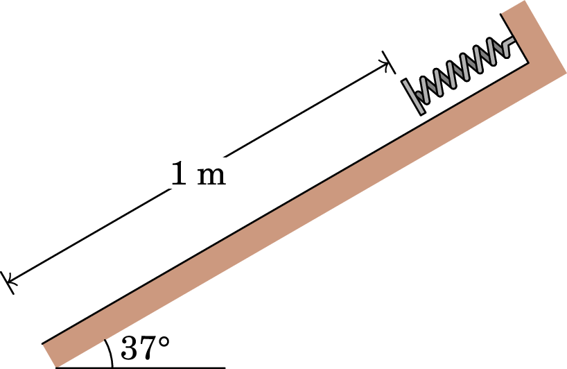 30. Na figura abaixo apresentada pode-se observar uma mola, cuja constante elástica é igual a 170 N/m. Esta está presa do alto de um plano inclinado a 37°, sem atrito. A extremidade inferior do plano está a 1 m do ponto de relaxação da mola. Uma lata de 2 kg é empurrada contra a mola durante 0.2 m e libertada do repouso. Determine a velocidade da lata: