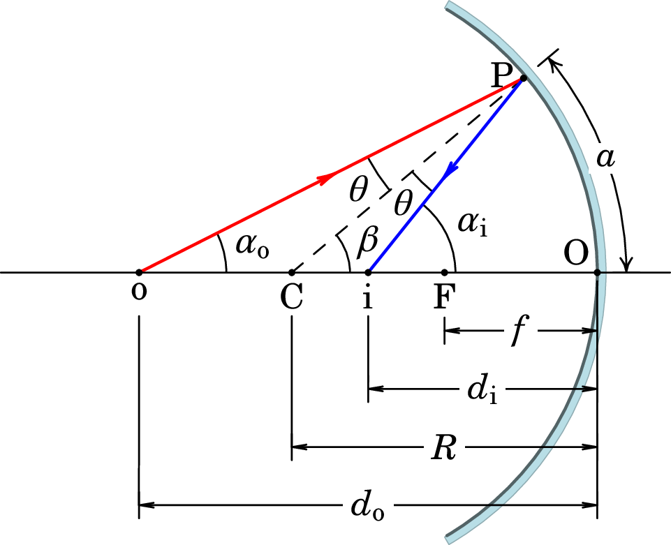 O arco , entre o ponto P e o vértice O, é um arco de raio R e ângulo , mas também é aproximadamente um arco de raio e ângulo , e aproximadamente um arco de raio e ângulo . A aproximação é muito boa no caso em que os raios incidente e refletido são paraxiais (aproximadamente paralelos ao eixo do espelho). Como tal, os três ângulos podem ser calculados em função do arco :