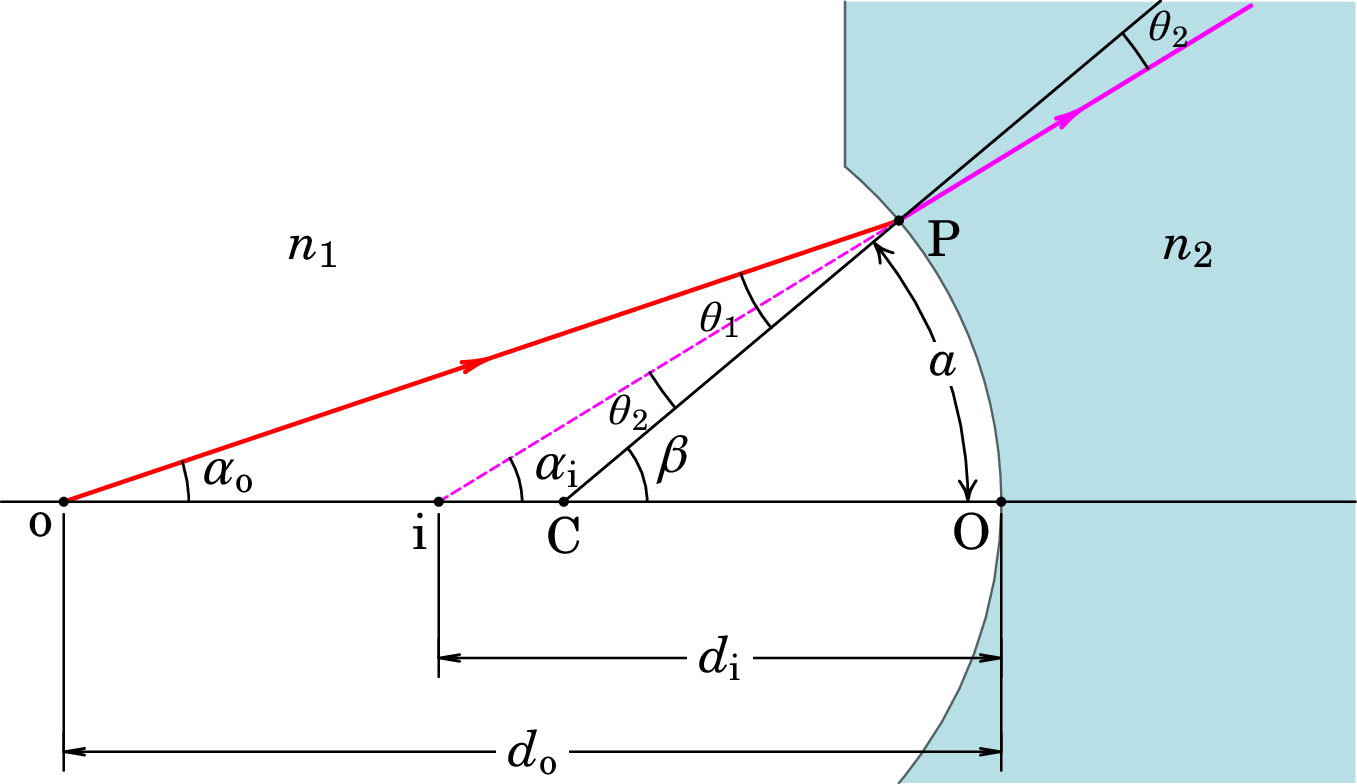As distâncias e são as distâncias desde os pontos o e i até o vértice O, que está na interseção da superfície com o seu eixo. Na figura, os ângulos foram exagerados, mas consideraremos unicamente raios paraxiais, aproximadamente paralelos ao eixo, e uma superfície que é apenas uma pequena parte da esfera completa.