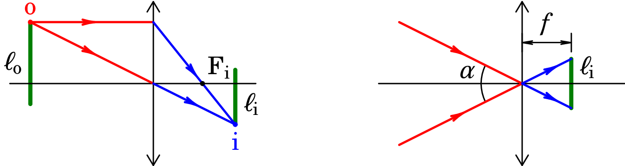 Quando o objeto é muito distante (), será mais conveniente usar o ângulo desde o vértice da lente até o objeto, e como a imagem é formada no foco, o tamanho da imagem será (lado direito da figura 2.18).