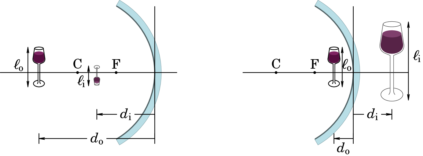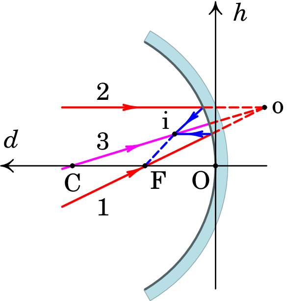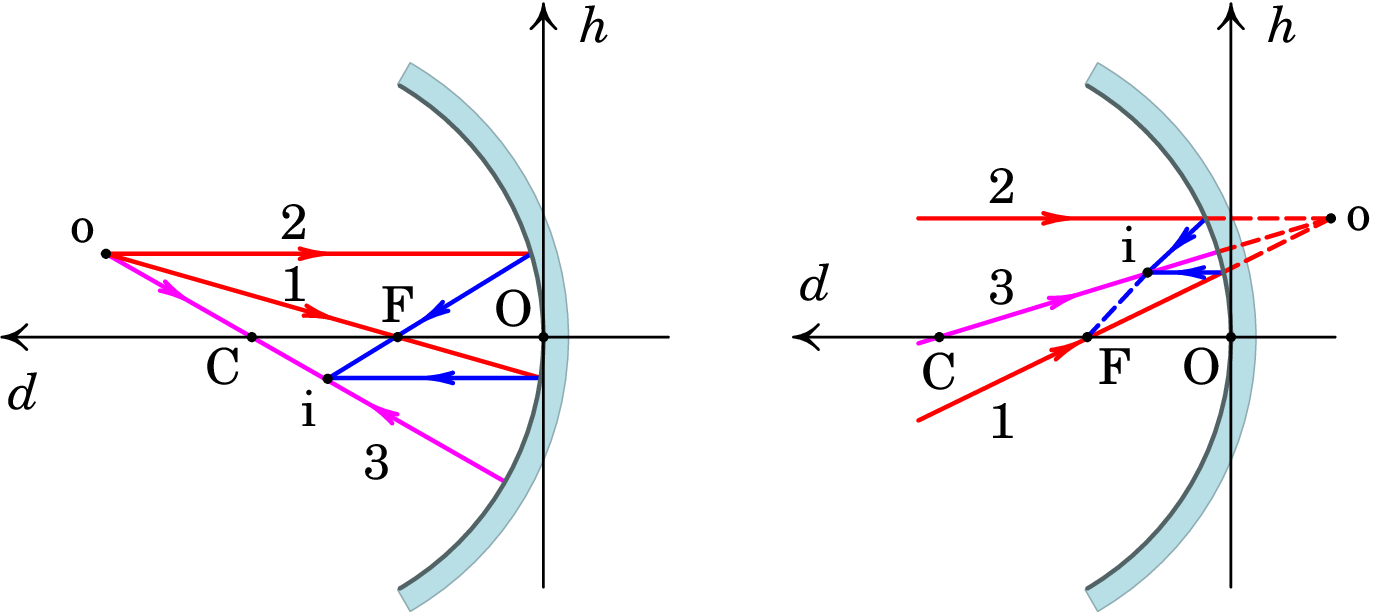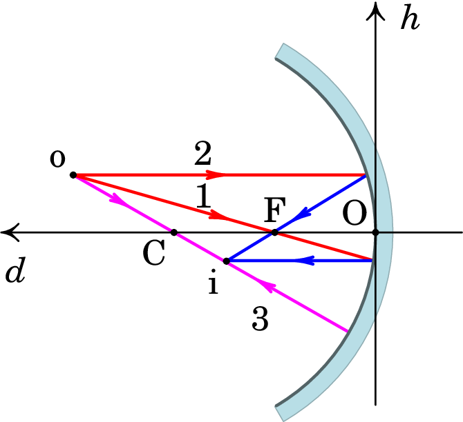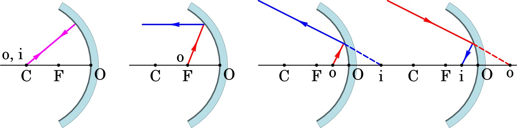 A figura 2.7) mostra os resultados obtidos com a fórmula de Descartes para algumas posições do objeto o. Se o estiver no centro do espelho, conduz à distância ; isto é, a imagem, real, é formada também no centro: todos os raios que saem do ponto o refletem-se sobre si próprios.