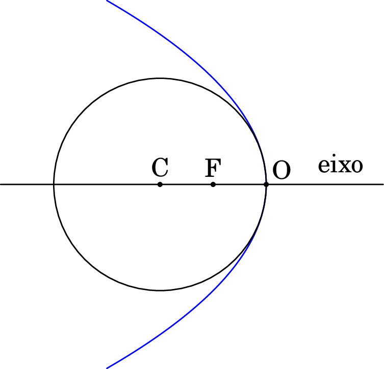 Numa parábola como a da figura 2.4, a distância focal é a distância desde o foco F até o vértice O. Como será demonstrado no exercício 2.1, perto do vértice a parábola pode ser aproximada por um arco circular de raio , igual a , e com centro C no eixo da parábola: