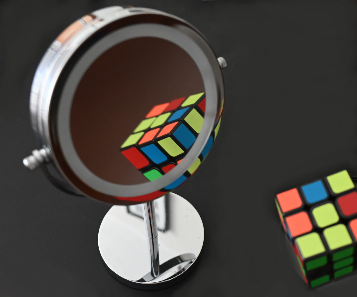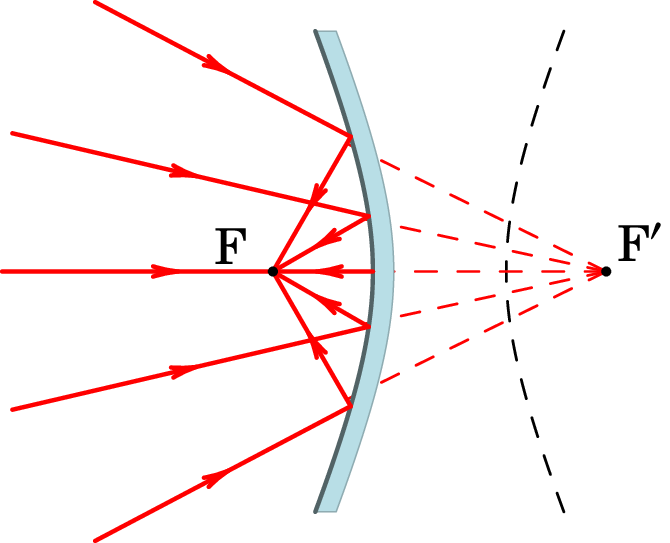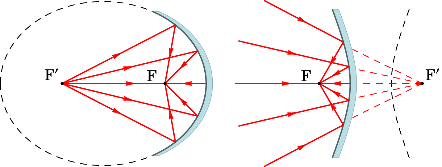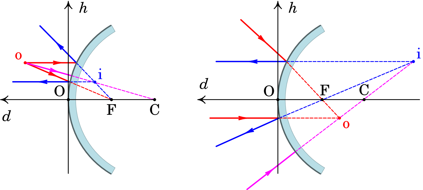 O princípio de reversibilidade da luz implica que podemos inverter a direção dos raios de luz no lado esquerdo da figura 2.5, obtendo-se assim o lado direito da figura. Os raios incidentes no espelho (vermelhos) aproximam-se entre si, e após serem refletidos (azul) convergem e cruzam-se no ponto i onde é formada a imagem. Neste caso trata-se de uma imagem real, que pode ser projetada num ecrã. Os raios convergentes que incidem no espelho podem vir, por exemplo, de um projetor. Se não houvesse espelho, esses raios focavam-se no ponto o indicado na figura, por detrás do espelho; a presença do espelho não permite que os raios se cruzem em o, mas a sua prolongação converge para o ponto virtual o, detrás do espelho.