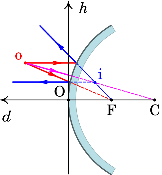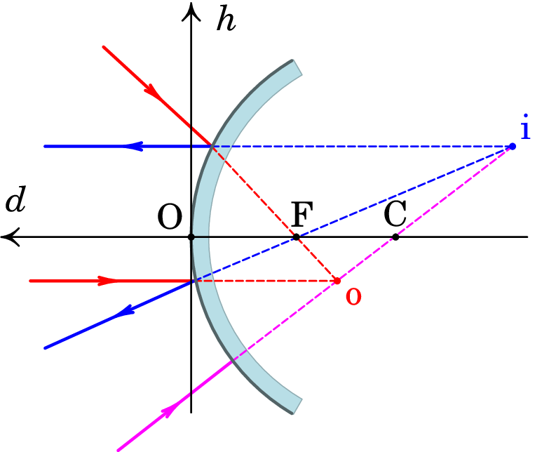 Os três raios principais cruzam-se num ponto i que está a uma distância do vértice O, que verifica exatamente a mesma equação (2.2) das imagens nos pontos no eixo do espelho. No caso da figura 2.8, em que o ponto o está a uma distância do eixo do espelho, a imagem é formada a uma distância do eixo, no outro lado do eixo, se o e i são ambos reais ou virtuais, ou no mesmo lado do eixo se um dos pontos o ou i for real e o outro virtual. Se arbitrarmos que as distâncias são positivas se estiverem por cima do eixo, e negativas se estiverem debaixo do eixo, encontra-se que a relação entre e é a mesma relação entre e , e essa relação é designada por aumento, :
