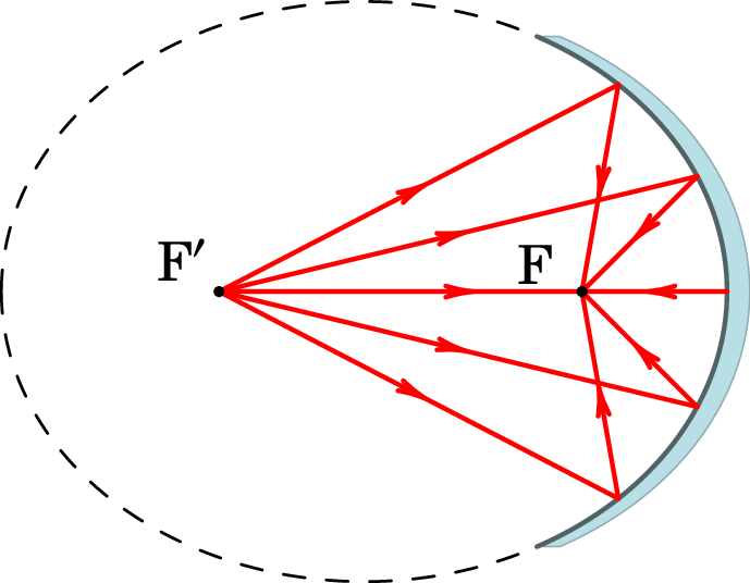 No caso do espelho elíptico do lado esquerdo da figura 2.2, com dois focos F e F, os raios de luz que saem de um dos focos são refletidos passando todos pelo outro foco. Neste caso, todos os raios luminosos entre F e F percorrem o mesmo percurso ótico, já que a soma das distâncias de qualquer ponto na elipse até os dois focos é constante.
