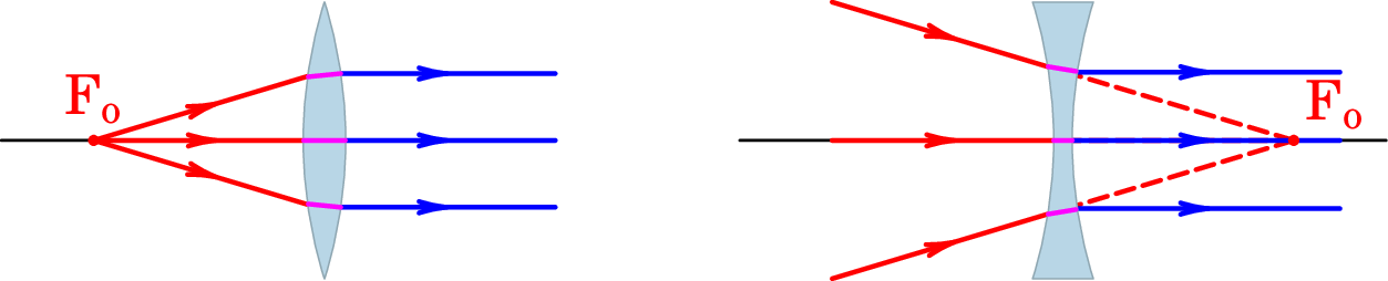 O foco objeto, , é o ponto a uma distância onde um ponto o deve ser colocado para que os raios de luz incidentes na lente e passando por esse ponto saiam da lente paralelos ao eixo (não há imagem). No limite , o resultado obtido em (2.14) para é o inverso da distância focal :