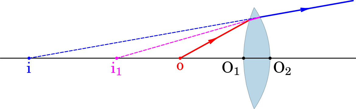 Por simplicidade, vamos admitir que o meio fora da lente é ar, com índice de refração igual a 1. Na figura 2.15, o raio incidente na primeira superfície da lente é indicado a vermelho, e passa pelo ponto o; o raio refratado nessa primeira superfície, indicado a roxo, interseta o eixo no ponto , onde é formada a imagem. As distâncias e verificam a formula de Descartes para refração em superfícies esféricas, (2.6), com , igual ao índice de refração da lente, e igual ao raio da primeira superfície: