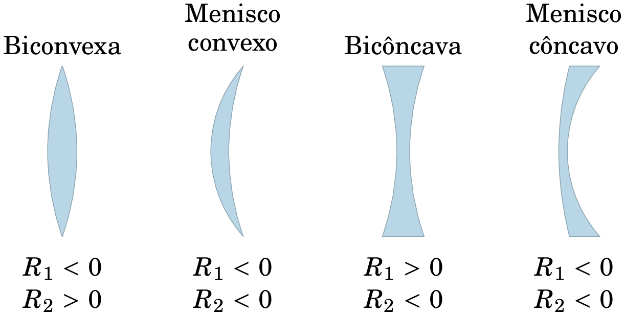 A figura 2.17 mostra alguns tipos de lentes. As duas primeiras são lentes convergentes () e as duas últimas são divergentes (). Se uma lente for mais larga no centro do que nos bordes é convergente, e se for mais estreita no centro do que nos bordes é divergente.
