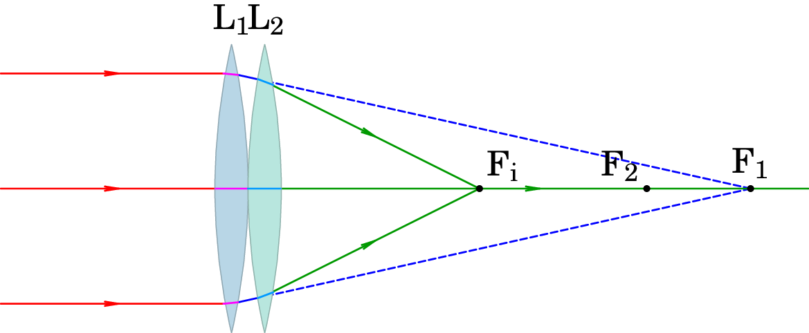 O foco imagem do sistema será o ponto onde convergem os raios incidentes, paralelos ao eixo, após serem refratados pelas duas lentes. Após a refração na primeira lente, os raios seguem na direção de , que está aproximadamente (se as lentes forem finas e estifverem muito juntas) à distância da lente 2, onde é a distância focal da lente ; a imagem formada pela lente estará no foco imagem do sistema que, por definição, está à distância , sendo a distância focal do sistema. Substituindo na fórmula de Descartes para a segunda lente,