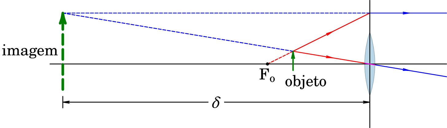 Já se o objeto for virtual, , a imagem poderá ser virtual e invertida, ou real e direita, e com tamanho maior ou menor do que o objeto. A figura 2.11 mostra dois casos, quando o objeto é real ou virtual.
