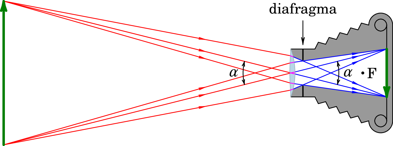 Valores elevados do número f implica que os raios que convergem para produzir cada ponto na imagem estão num ângulo menor, dando maior profundidade de campo, ou seja, objetos que não estejam exatamente à distância que está a ser focada na película fotográfica, aparecem ainda aproximadamente focados. No caso da câmara escura, a abertura aproxima-se de zero, o que implica número f muito elevado e uma imagem que aparece sempre focada, mas com baixa luminosidade.