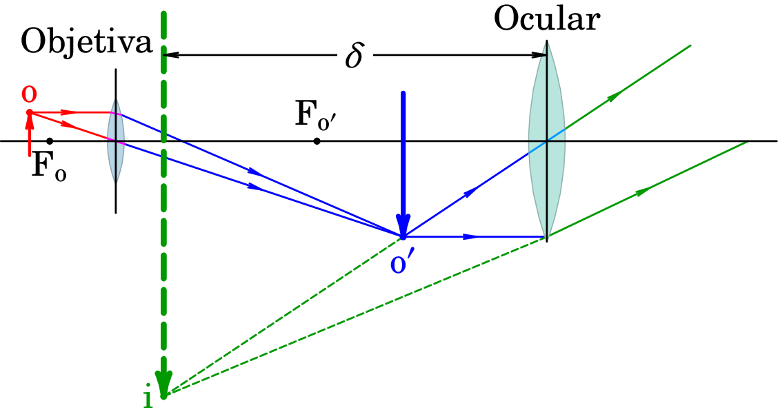 O microscópio é composto por duas lentes convergentes, a objetiva, mais próxima do objeto, e o ocular, mais próxima do observador. A objetiva atua de forma semelhante a um projetor: o objeto coloca-se entre o centro e o foco da objetiva, formando assim uma imagem real, invertida e de tamanho maior do que o objeto. O ocular atua como uma lupa aumentado ainda mais o tamanho da imagem: o ocular desloca-se de forma a que a imagem produzida pela objetiva esteja entre o sue foco e o seu vértice (figura 2.23).