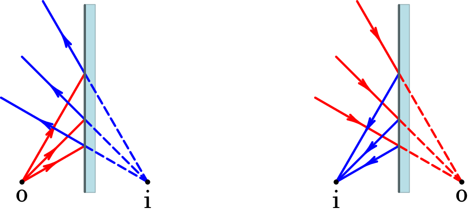 Nas secções seguintes, a letra o representa um ponto que designamos de objeto e a letra i designa o ponto onde é formada a imagem desse ponto o, após a luz ser refletida num espelho, ou refratada numa superfície ou numa lente. O objeto o pode ser um ponto luminoso, que emite raios de luz em direções radiais, tal como no lado esquerdo da figura 2.5, em que o ponto luminoso encontra-se frente a um espelho plano. Os raios refletidos divergem entre si, e parecem vir do ponto i onde é formada uma imagem virtual. Para maior claridade, os raios que incidem no espelho foram desenhados a vermelho, e os raios refletidos a azul.