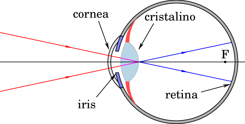 O olho humano, tal como uma máquina fotográfica, projeta uma imagem real de um objeto, reduzida e invertida, na retina (figura 2.20) onde existem células sensíveis á luz que enviam impulso elétricos para o cérebro. Para focar as imagens de objetos a diferentes distâncias, não é afastada ou aproximada a lente, como numa máquina fotográfica, mas altera-se a distância focal da lente. Há realmente duas lentes no olho, uma mais externa, formada pelo humor vítreo, e outra mais interna: o cristalino. O humor vítreo tem forma e índice de refração fixos, enquanto que o cristalino pode mudar a sua forma, por contração do músculo à sua volta, alterando a sua curvatura e distância focal.