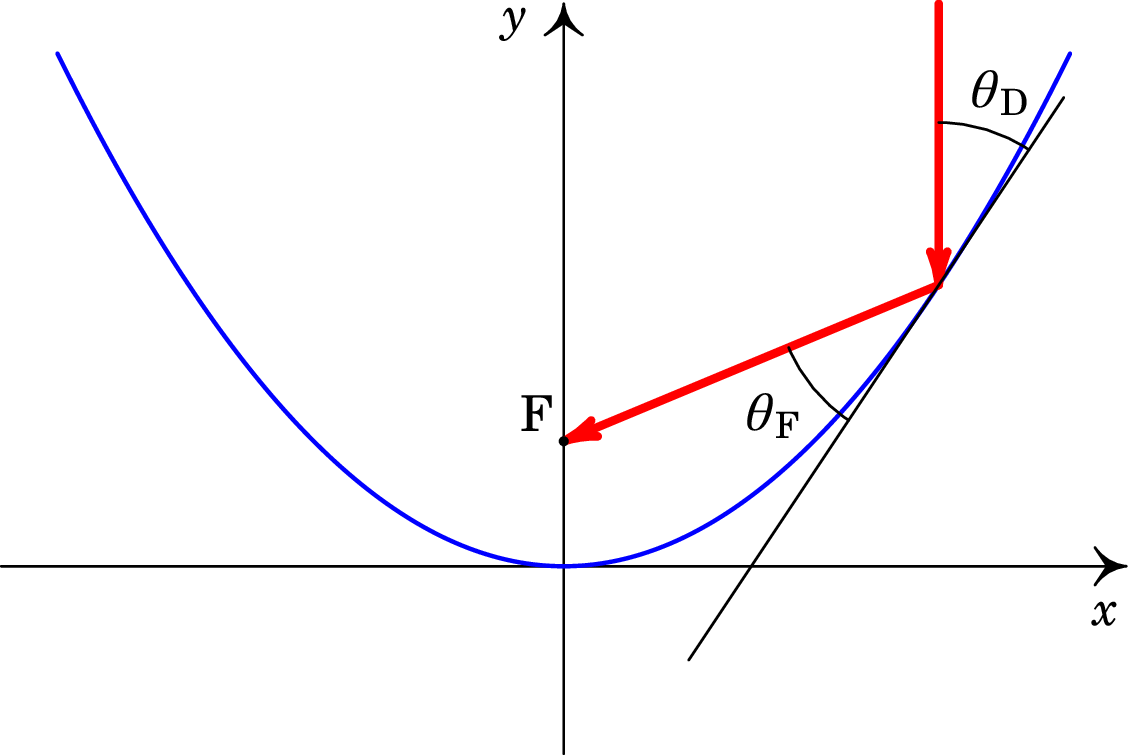 Esses dois vetores são os simétricos dos vetores e da alínea anterior e, como tal, os ângulos e são os mesmos ângulos da alínea anterior, que são iguais. Conclui-se assim que o raio que passa pelo foco é a reflexão do raio incidente paralelo ao eixo da parábola. Como o resultado é válido para qualquer ponto na parábola, qualquer raio paralelo ao eixo será refletido na direção do foco.