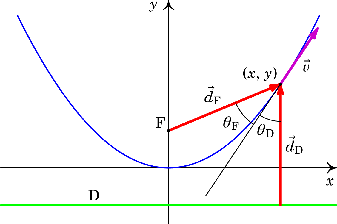 (c) A figura seguinte mostra o vetor , desde o foco F até um ponto na parábola, o vetor , desde a diretriz D, na direção perpendicular, até o mesmo ponto na parábola, e o vetor tangente à parábola no mesmo ponto.