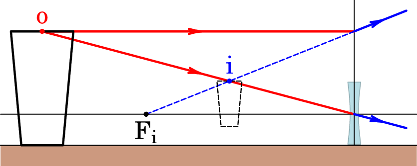 Para construir a imagem, foi traçado o ponto o no topo do copo, que está 8 cm por cima do eixo e a 30 cm do plano da lente. A seguir foram traçados dois dos raios principais desde o ponto o; o primeiro, sai do ponto o e passa pelo vértice da lente (interseção do eixo com o plano da lente). O segundo raio sai do ponto, paralelo ao eixo, e ao chegar ao plano da lente é refratado para cima, porque a lente é divergente; o raio refratado foi traçado usando uma linha auxiliar desde o foco imagem da lente (20 cm à esquerda do plano da lente e sobre o eixo) até o ponto onde o raio incidente toca o plano da lente; a extensão dessa linha auxiliar a partir desse ponto é o raio refratado.