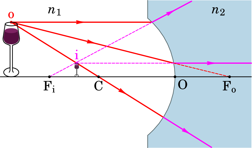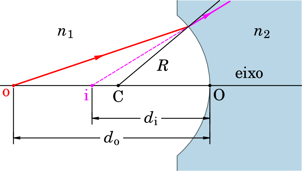 No caso da figura 2.12, o ponto o encontra-se a uma distância do vértice, e como o raio refratado diverge do eixo, parecerá vir de um ponto i, a uma distância do vértice. Igual que no caso da reflexão nos espelho curvos, as distâncias e serão medidas na direção do eixo, com origem no vértice e com sentido positivo apontando para o lado onde incidem os raios luminosos na superfície, que é o meio com índice de refração . O lado negativo é no meio com índice de refração , onde os raios luminosos são refratados. Tal como nos espelhos, o objeto o é real se é positiva, ou virtual se é negativa. Já no caso da imagem, esta é real se é negativa, ou virtual se é positiva (ao contrário do que nos espelhos).