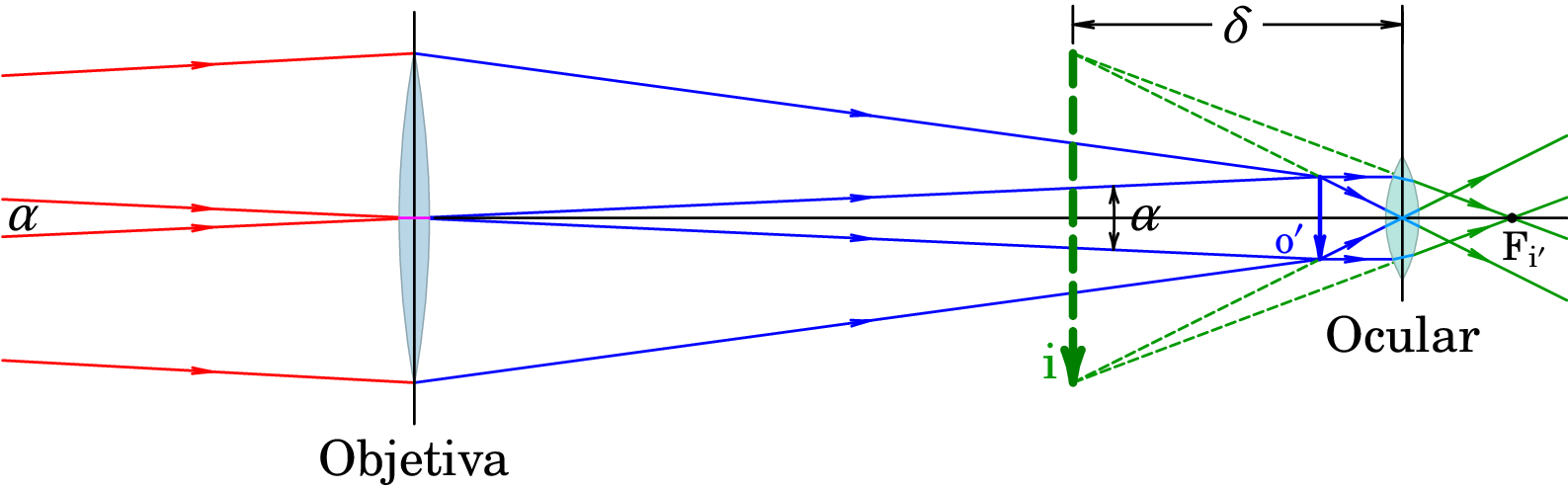 A diferença entre o telescópio refrator e o microscópio é que o objeto encontra-se longe, a uma distância várias vezes maior do que o raio da objetiva. A imagem produzida é assim real, invertida, e de menor tamanho do que o objeto (não seria possível projetar dentro do telescópio uma imagem maior do que o tamanho de um planeta, por exemplo). O ocular, tal como no microscópio, usa-se como uma lupa, para aumentar o tamanho da imagem da objetiva; deslocando o ocular de forma a que a imagem real da objetiva esteja entre o seu foco e o seu vértice, obtém-se uma imagem virtual, e maior do que a imagem produzida pela objetiva (figura 2.24).