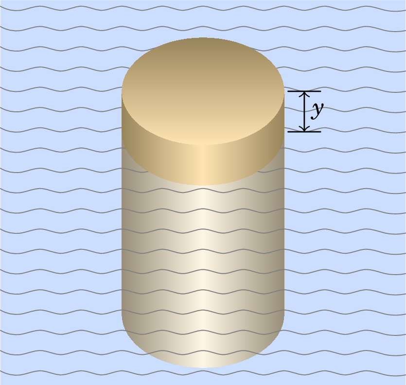 Pelo princípio de Arquimedes, a impulsão é igual ao peso do volume de fluído deslocado. E esse peso é vezes a massa de fluído deslocado, que é o volume da parte submersa do cilindro, , vezes a densidade do fluído. Assim, a força resultante em função de é:
