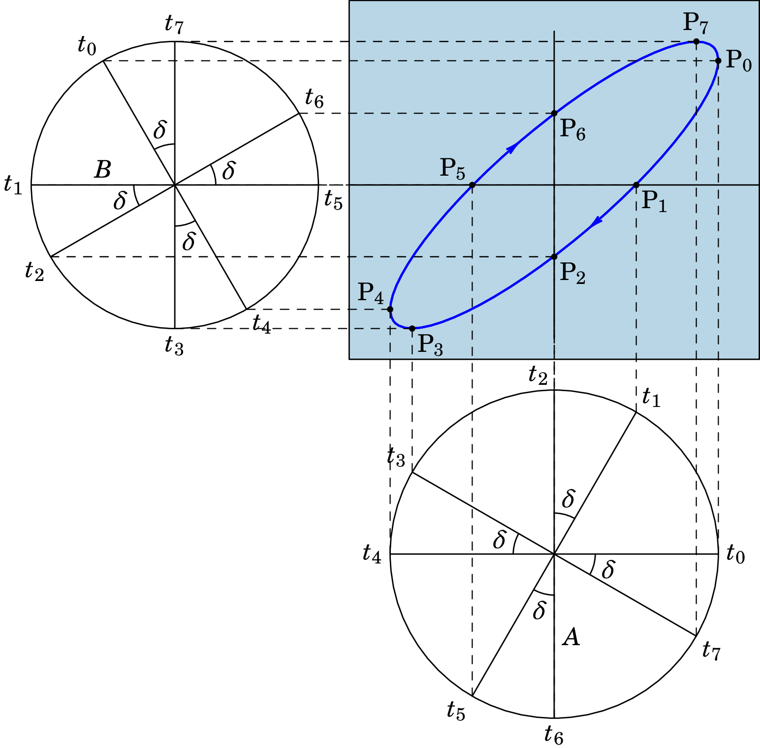 Em , passa pelo ponto com coordenadas e , no semieixo positivo . Assim sucessivamente, até chegarmos ao instante em que a partícula atravessa o semieixo positivo ; nesse instante, e a coordenada onde a partícula cruza o semieixo positivo é . Em , a coordenada da partícula tem o seu valor máximo . Comparando as coordenadas dos pontos e , temos que . Como tal, o desfasamento entre os dois movimentos harmónicos pode ser determinado a partir da relação entre e :