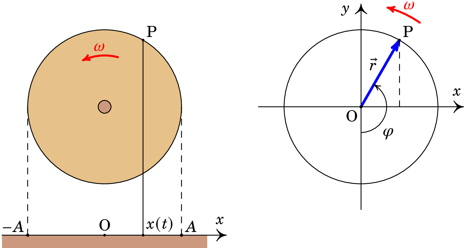 Na periferia da roda há um pino P. A projeção da posição do pino no plano horizontal desloca-se entre dois pontos à distância da projeção do eixo da roda no ponto O. Num eixo com origem no ponto O e na direção do movimento da projeção de P, a posição da projeção de P é dada pela função , que verifica a equação (3.5) do movimento harmónico simples.