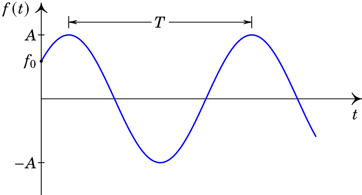 A amplitude é o valor máximo da função; o valor mínimo é . a constante é a frequência angular, e é a fase inicial. A figura 3.2 mostra o gráfico da função. O tempo entre dois instantes sucessivos em que a função tem o seu valor máximo é o período de oscilação.