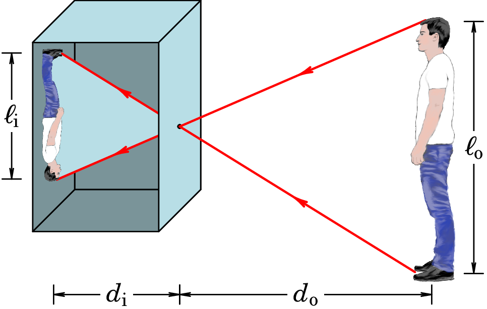 Resolução. (a) A figura acima mostra os raios que produzem as imagens dos dois extremos do objeto. como o ângulo entre esses raios é o mesmo nos dois lados do orifício, o triângulo formado pelo objeto e o orifício é semelhante ao triângulo formado pela imagem e o orifício. A semelhança de triângulos implica: