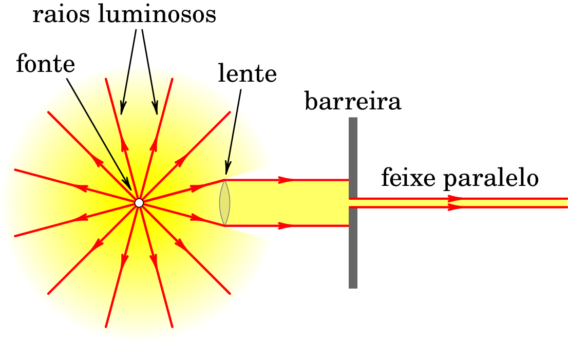 Os raios luminosos, que saem de um ponto luminoso nas direções radiais, podem ser desviados produzindo um feixe com raios paralelos, tal como na figura 1.2. Coloca-se uma lente convergente frente da fonte, a uma distância apropriada, que faz com que o feixe de luz cónico que sai da fonte e atinge a lente seja desviado formando um feixe cilíndrico. O tamanho do feixe pode ser reduzido colocando uma barreira com um pequeno orifício circular; o feixe paralelo é composto por raios de luz paralelos.