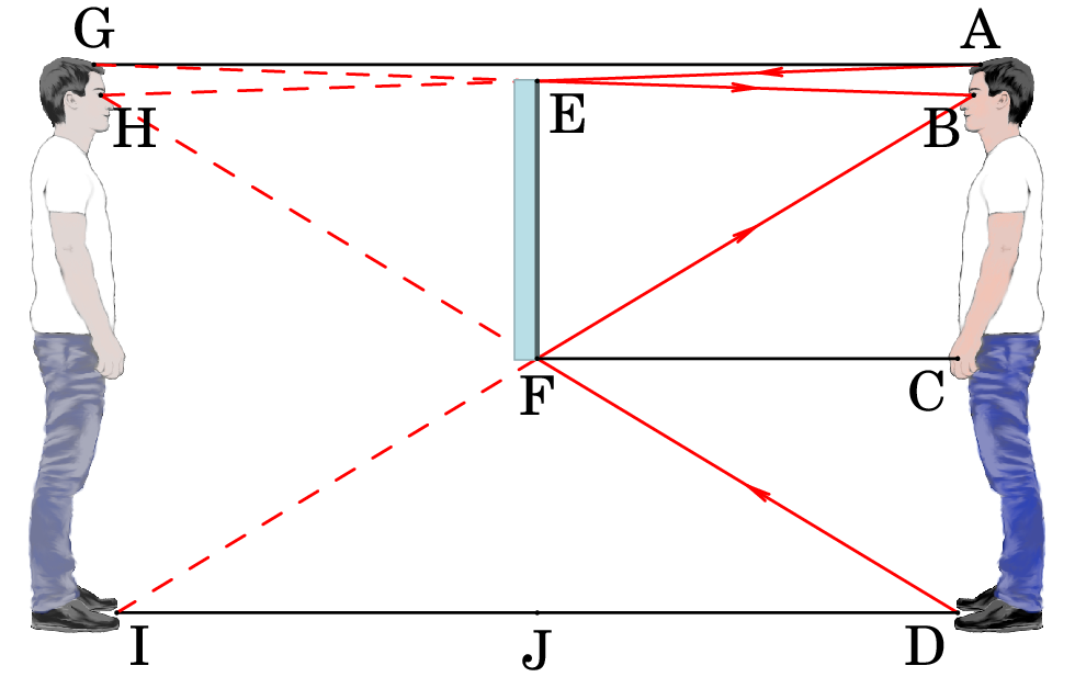 Para que o homem possa ver a sua imagem completa, deverá poder ver os raios DFB e AEB, que partem da parte mais baixa dos seus pés, e da parte mais alta do seu cabelo, e chegam aos seus olhos em B. O tamanho mínimo do espelho deverá ser então a distância entre E e F, onde esses dois raios são refletidos no espelho.