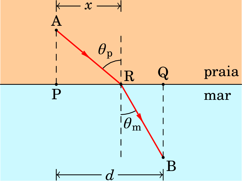 Resolução. Não há duvida que se os pontos inicial e final estão ambos na praia ou ambos no mar, a trajetória mais rápida é um segmento de reta. Como tal, a trajetória ótima desde A até B serão dois segmentos de reta, um na praia e outro no mar. Mas os esses dois segmentos, AR e BR na figura acima, não têm de ser parte dum mesmo segmento de reta entre A e B. O ponto R encontra-se unidades à direita de B, e o valor ótimo de é o que faz com que o tempo desde A até B seja mínimo.