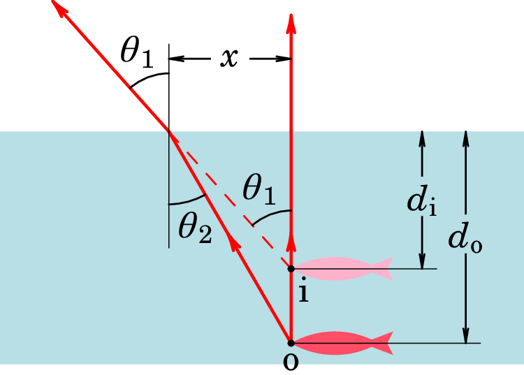 Resolução. A figura seguinte mostra dois raios luminosos que partem de um ponto "o" no peixe: um primeiro raio vertical, perpendicular à superfície da água, que atravessa para o ar sem ser desviado, e um segundo raio que atinge a superfície da água a um ângulo com a vertical, e sai para o ar formando um ângulo com a vertical.