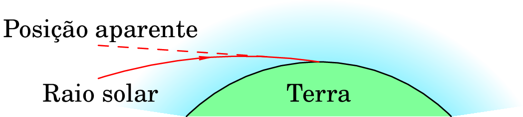 A curvatura dos raios luminosos que atravessam regiões de ar com variações no índice de refração explica também porque conseguimos continuar a ver o Sol mesmo depois de ter descido abaixo do horizonte. Neste caso as camadas de ar menos densas, com menor índice de refração, são as que estão a maior altura na atmosfera; a menor densidade é devida à menor pressão, e não a temperatura maior como no caso da miragem. O resultado é que os raios solares curvam-se no sentido indicado na figura 1.9. Um observador na superfície da Terra vê a imagem do Sol na prolongação da tangente à curva no ponto em que o raio solar chega à superfície solar, um certo ângulo por cima do horizonte, quando o Sol está realmente por baixo do horizonte.