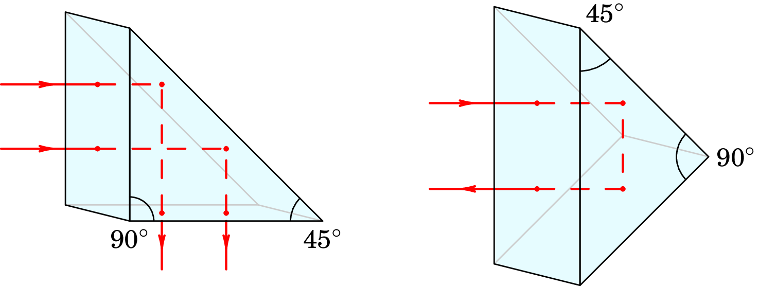 Para que exista reflexão total nos prismas da figura 1.11, o ângulo crítico do vidro do prisma, em relação ao ar, deverá ser menor do que . Substituindo para o ar, na equação (1.7), e , obtém-se que o índice de refração que conduz a ângulo crítico de é . O vidro costuma ter índice de refração maior do que esse valor e, como tal angulo crítico menor do que ; qualquer tipo de vidro pode ser usado para o prisma de reflexão total.