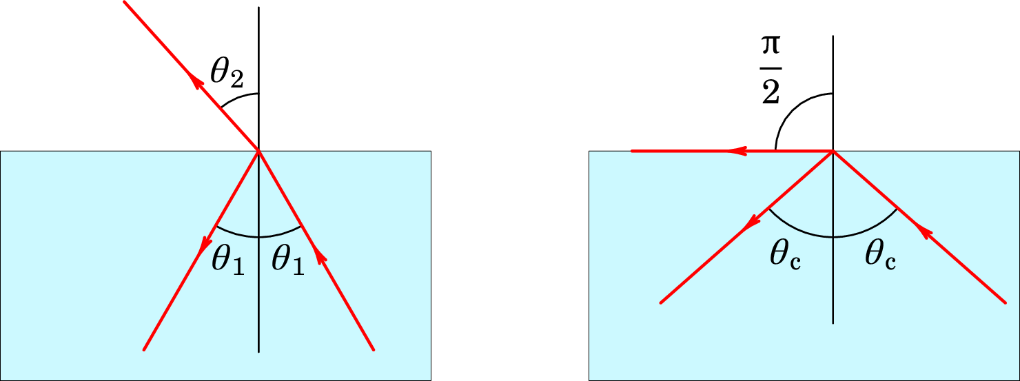 Quando a luz passa de um meio com índice de refração maior para outro com menor índice de refração, o ângulo de refração é maior do que o ângulo de incidência. Aumentando o ângulo de incidência, chega-se a uma situação em que o ângulo de refração é igual a , como no lado direito da figura 1.10.