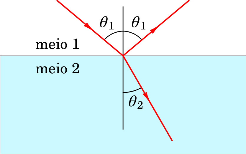 Quando um raio de luz passa de um meio 1 para outro meio 2 como na figura 1.7, parte da luz é refletida no meio 1 e outra parte é refratada, passando para meio 2. O ângulo que o raio refratado faz com a perpendicular, , é diferente do ângulo que o raio incidente faz com a perpendicular à superfície de separação entre os dois meios, .