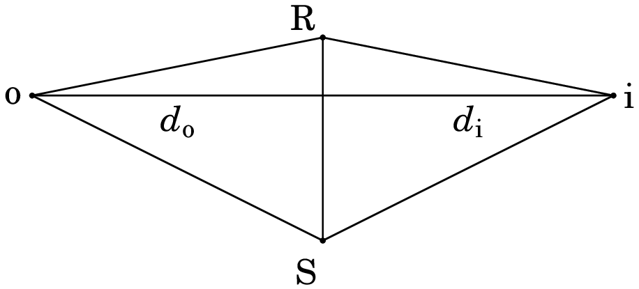 Os dois raios refletidos em R e em S parecem vir do ponto comum i, no outro lado do espelho. Os ângulos de incidência e reflexão do raio em R são iguais, e são iguais também ao ângulo que o segmento RI faz com a perpendicular ao espelho ( na figura). E os ângulos de incidência e reflexão do raio em S são iguais, e são iguais também ao ângulo que o segmento SI faz com a perpendicular ao espelho ( na figura). Os ângulos e são ambos iguais a e, como tal . De forma semelhante, , porque ambos ângulos são iguais a . A igualdade da base, RS, e dos dois ângulos nessa base, implica que os dois triângulos, ORS e IRS, são semelhantes. As distâncias do ponto e da sua imagem até a superfície do espelho ( e ) são as alturas desses triângulos, que são iguais, porque os triângulos são semelhantes: